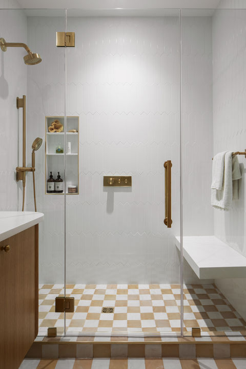 Our Marine Terminal Lofts client wanted to turn their library into a guest suite with a walk-in closet for their visiting family. We remodeled the adjacent bathroom to match the vibe of the homeowners next phase of their life. We also closed off the front of the room with custom doors to match the architecture of the exterior windows while expressing the beautiful concrete columns that are prevalent throughout the building.